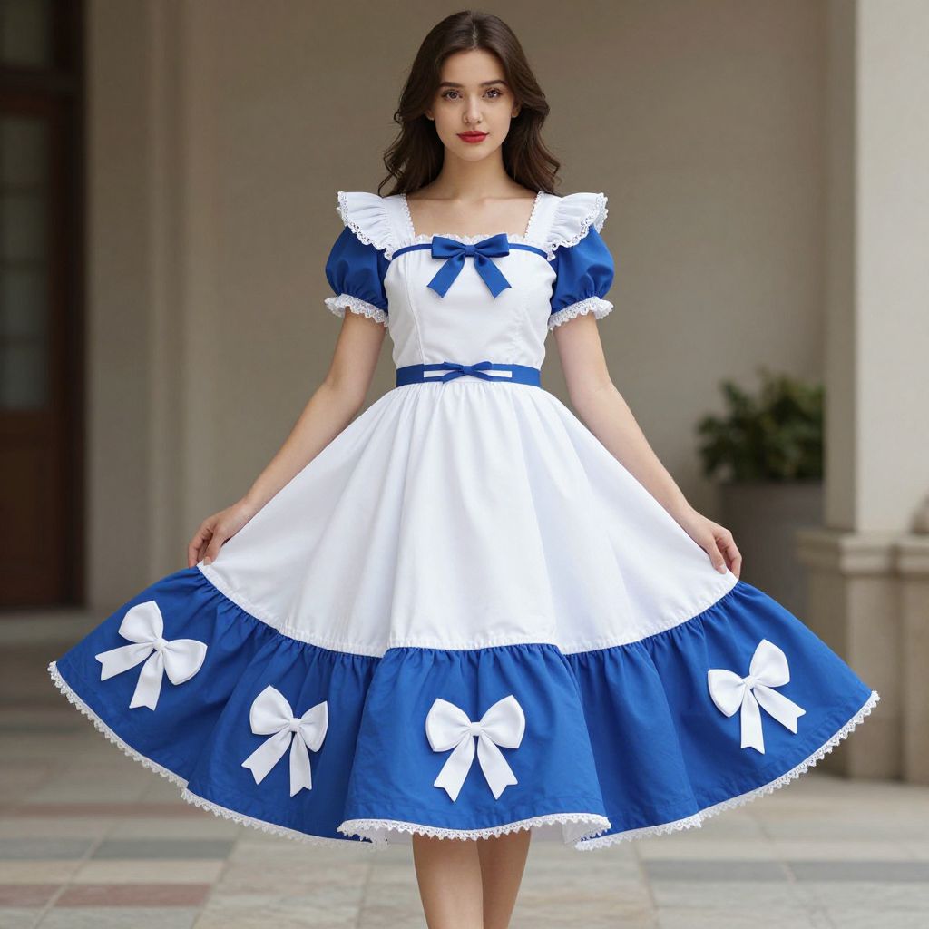 Photograph of a young woman with fair skin, dark wavy hair, wearing a blue and white Alice in Wonderland-style dress with white bows, standing