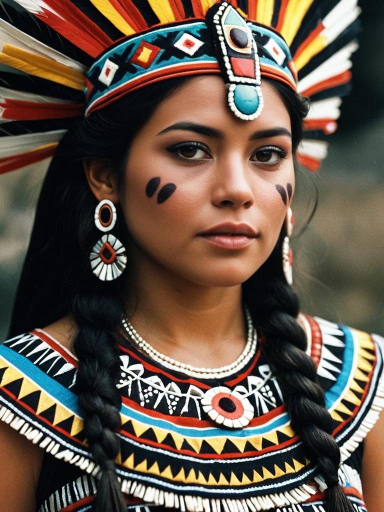 Woman in Aztec Princess Dress costume, photorealistic close-up headshot
