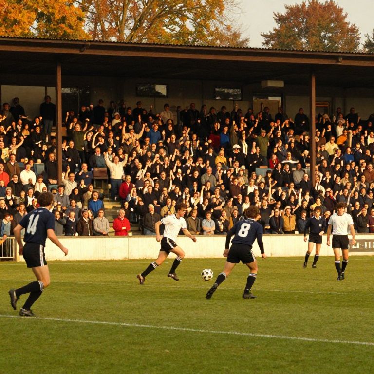 Wankdorf historic football match scene, vintage players in action, packed stands with enthusiastic fans, nostalgic atmosphere, autumn setting, warm golden light, dynamic composition capturing the spirit of classic sports events, painterly realism.