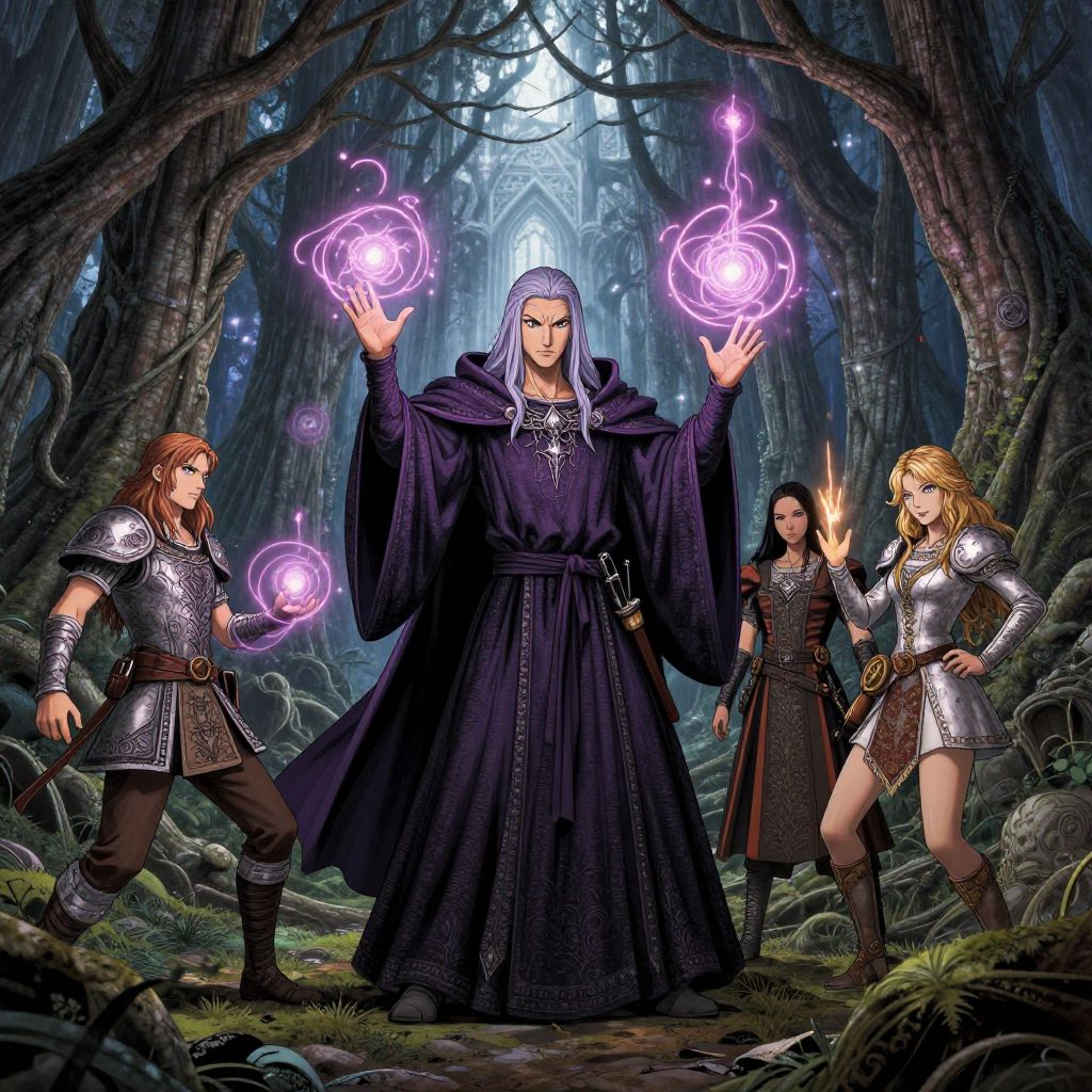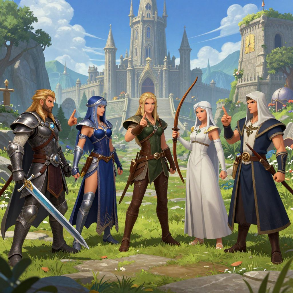 Fantasy digital art: five warriors in medieval armor and a nun stand in a lush, castle-filled landscape, ready for battle. Bright blue sky,