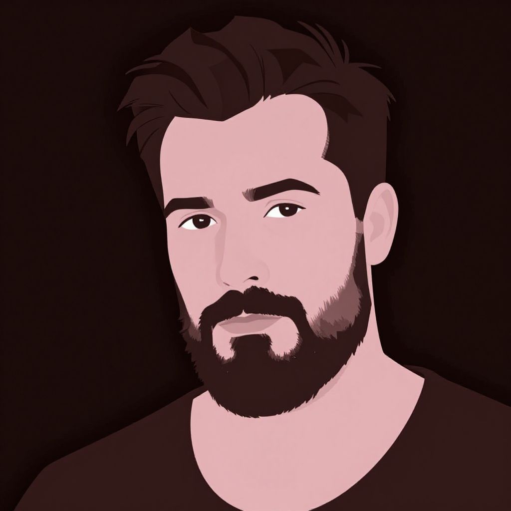 Digital drawing of a bearded man with a fair complexion, dark brown hair, and black beard, set against a solid dark purple background. The man's eyes are dark brown, and he has a neutral expression. His hair is styled in a slightly messy, upward swept fashion. He is wearing a simple black shirt. The image is highly stylized with a limited color palette, primarily using shades of pink and purple to highlight the man's facial features. The overall style is reminiscent of vector art, with clean, bold lines and a minimalist approach.