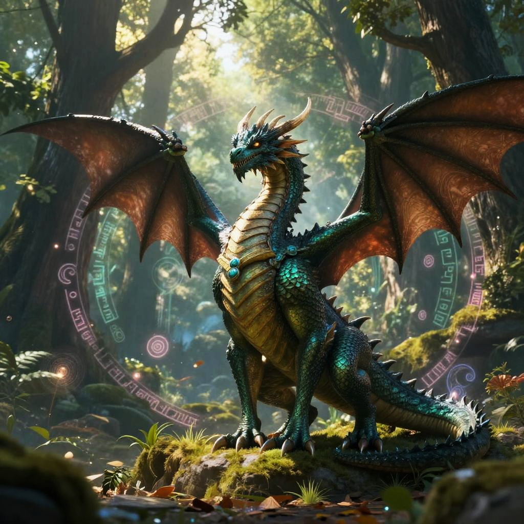 Draghi shown as a noble dragon embodying strength and wisdom, standing in a lush enchanted forest with light filtering through ancient trees, surrounded by magical runes and ethereal light effects, high resolution fantasy art.