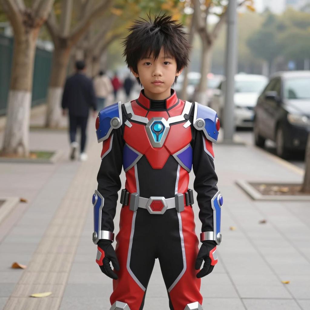 Beyblade costume, photo of young boy, standing on sunny sidewalk, wearing detailed superhero costume, black shaggy hair, red and black with blue and purple accents, futuristic design, daytime, blurred background with trees and people, street lined with parked cars, autumn leaves on ground, natural light, casual pose, realistic style, slight bokeh effect