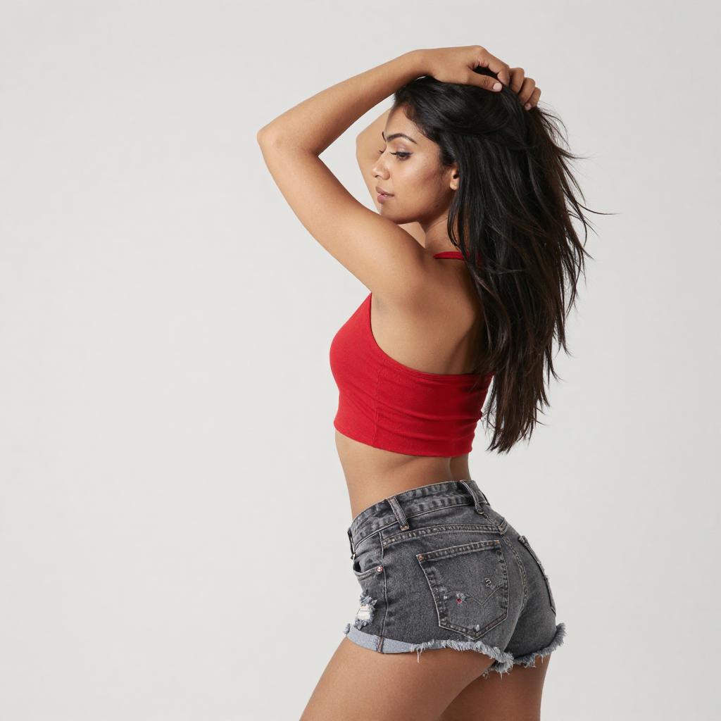 Photograph of a woman with long dark hair, wearing glasses and a white crop top, standing in a dark room with vibrant neon pink, blue, and purple lights. She covers her mouth with one hand, her other arm raised above her head. The colorful lights create dramatic shadows and highlights on her body.