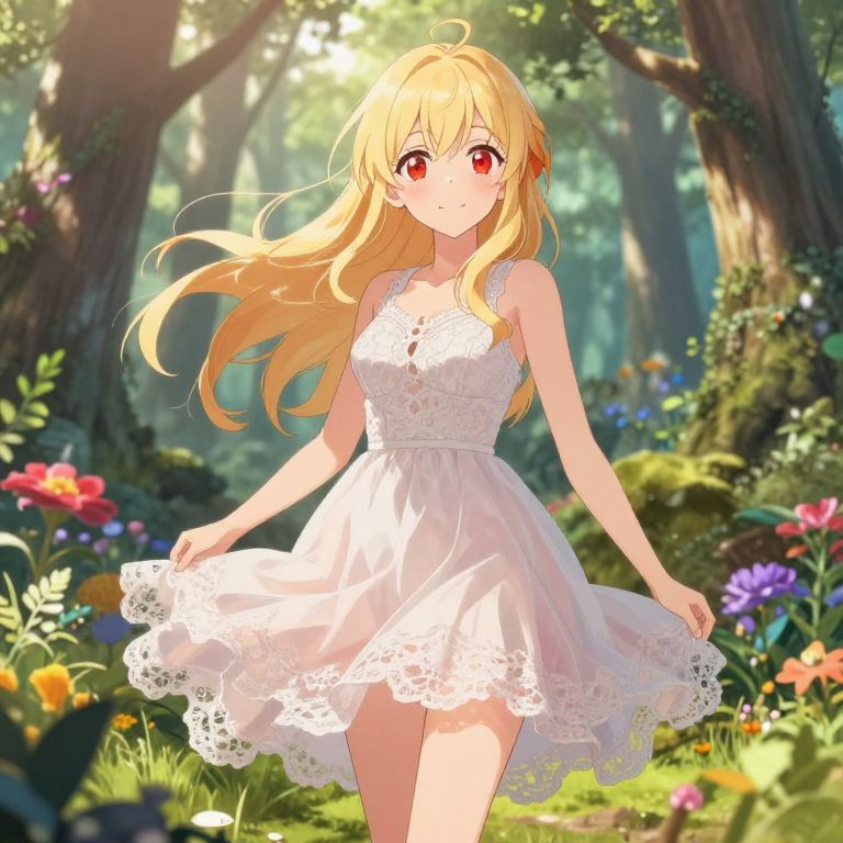 Yellow hair girl anime in a magical forest, sparkling golden hair with luminous highlights, large expressive eyes, holding a glowing staff, mystical creatures around, detailed fantasy environment with glowing plants and magical light sources.