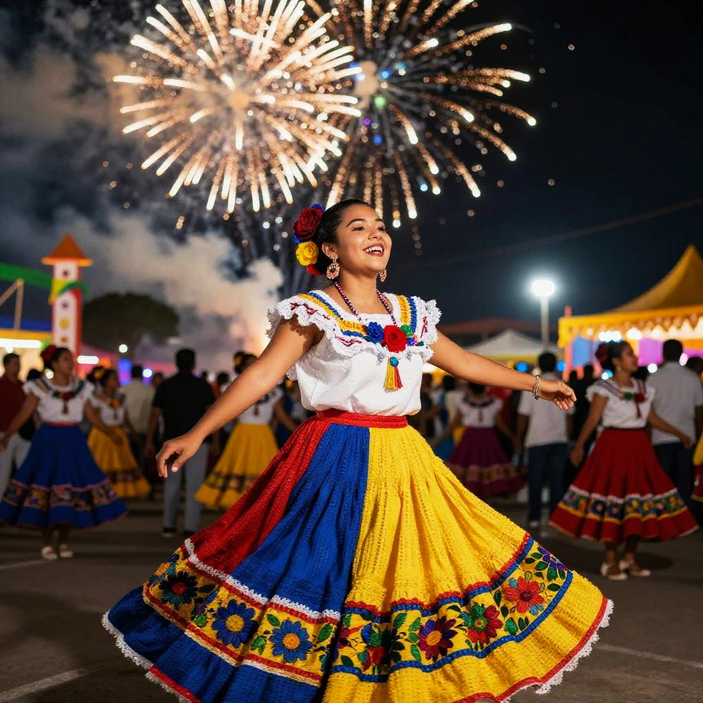 Lupe in a vibrant festival setting, colorful traditional attire, lively crowd, firework displays in the sky, joyful expression, festive decorations, dynamic movement captured with rich textures and bright lighting