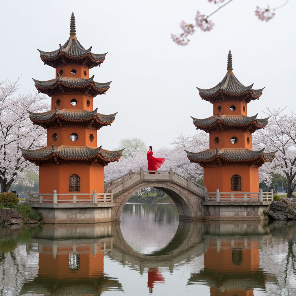 A serene arch bridge connects two intricately designed orange pagodas, each adorned with layered eaves and ornate details, while a woman in a flowing red dress stands gracefully atop, surrounded by blossoming cherry trees and a tranquil lake reflecting the ethereal beauty of the scene.