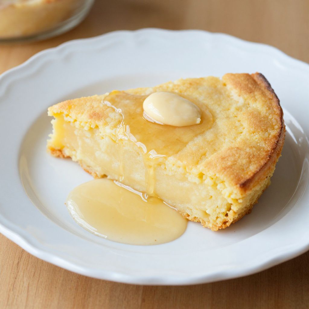 Buttermilk cornbread with butter and maple syrup on white Pioneer Woman plate