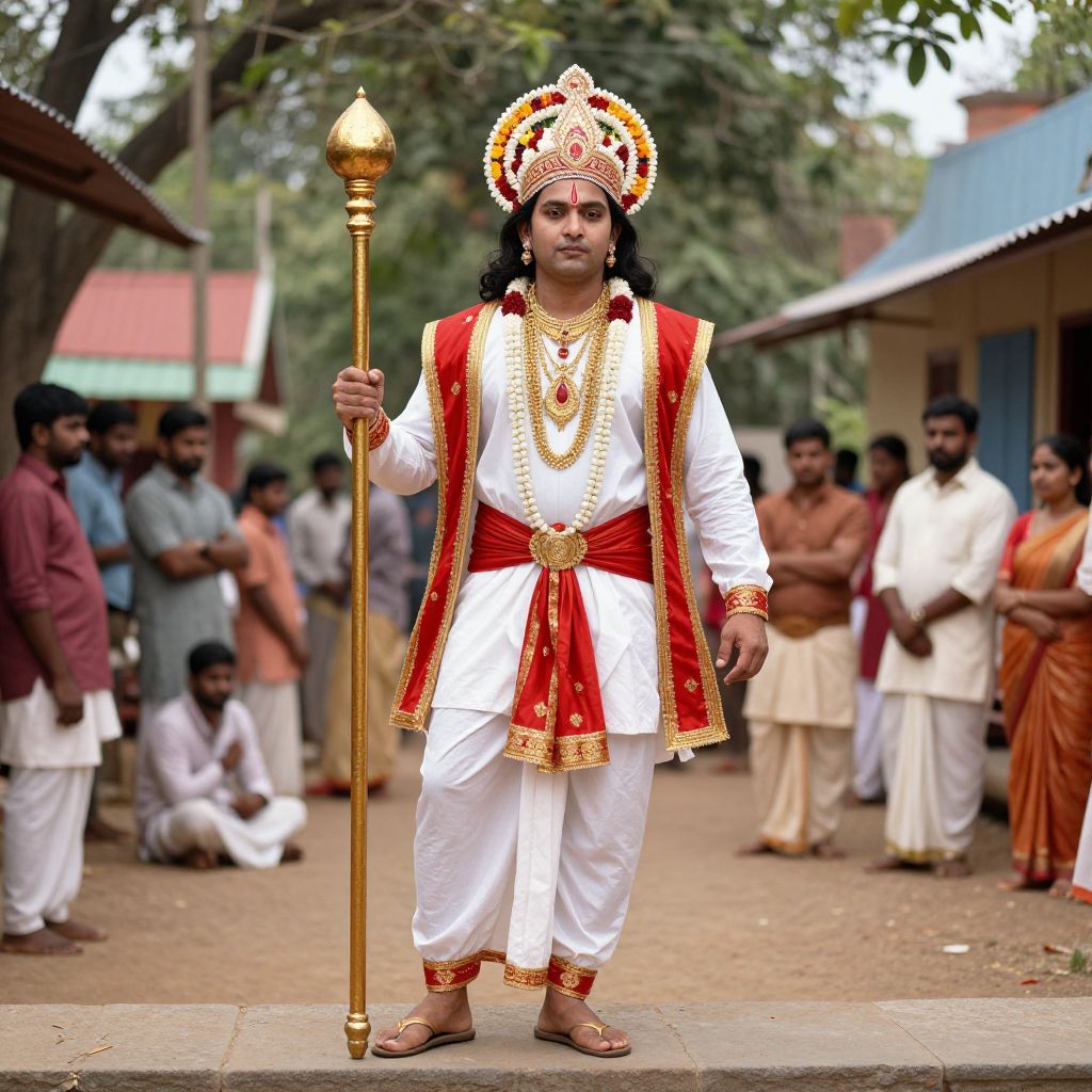 Photograph of a South Indian Hindu priest in traditional white and red attire, holding a golden staff, with a decorated crown, standing in a village street