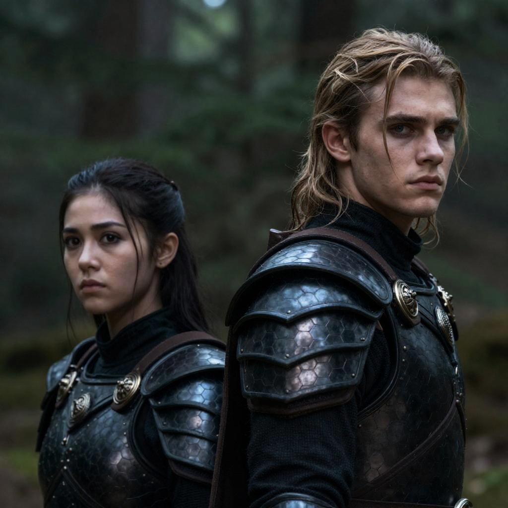 Photograph of two people in a forest. Young man with wet, blonde hair, intense gaze, wearing dark, hexagonal-patterned armor. Young woman with dark hair, serious expression, in similar armor. Green, blurred forest background. Both facing left.