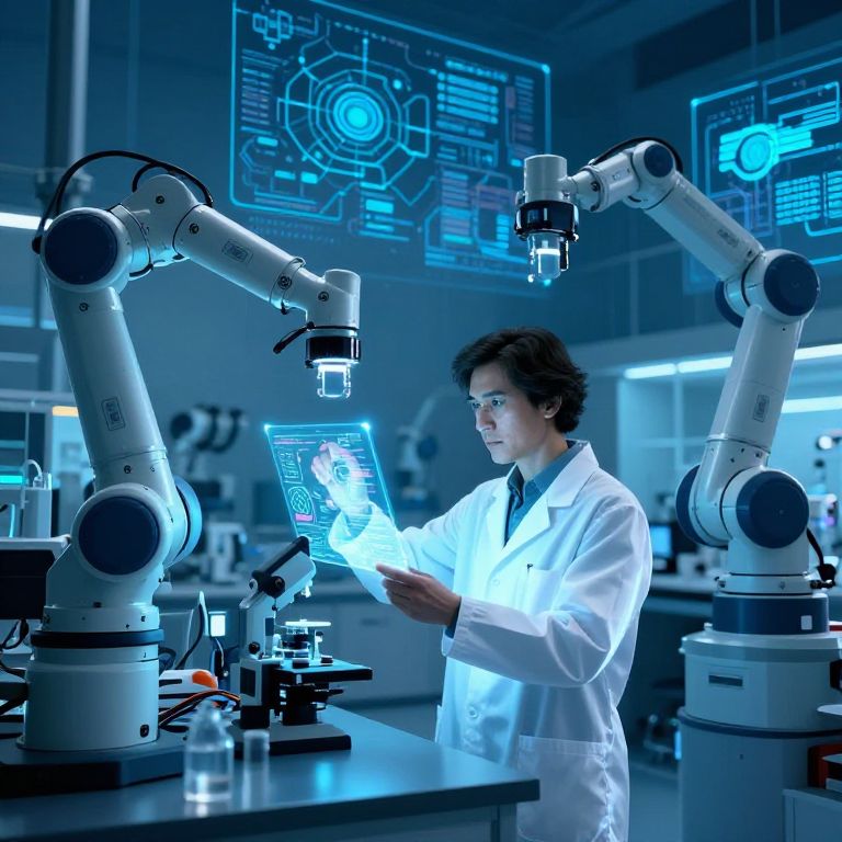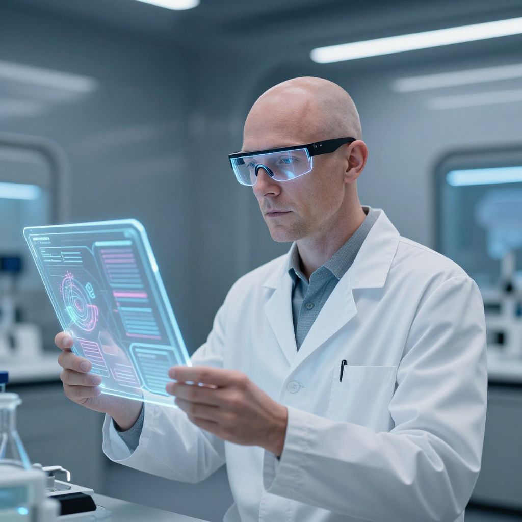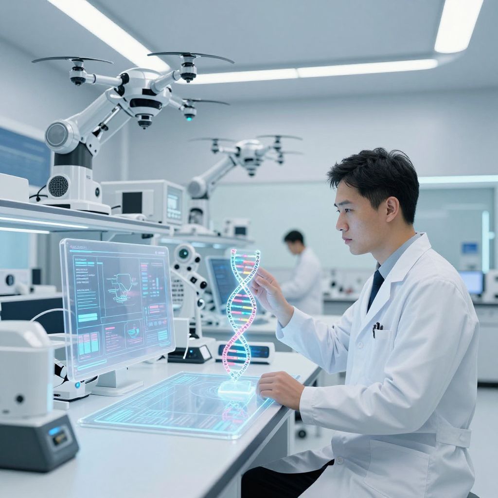 Futuristic laboratory filled with transparent touchscreens, floating robotic drones, and advanced AI interfaces, bright sterile environment with soft white and silver hues, a scientist interacting with a holographic 3D model of DNA, clean and high-tech aesthetic