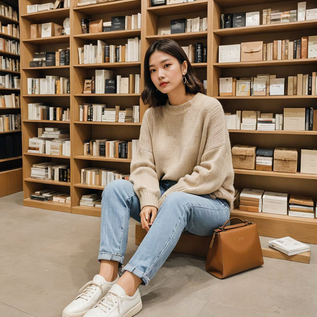 Photo of a Slim woman, Textured Crop outfit inspo, casual chic with an oversized beige sweater, distressed denim jeans, white sneakers, leather crossbody bag, gold hoop earrings, minimalist style, neutral tones, cozy materials, Moss Green, Ramie, cargo, slippers, quaint bookstore, oversaturated film