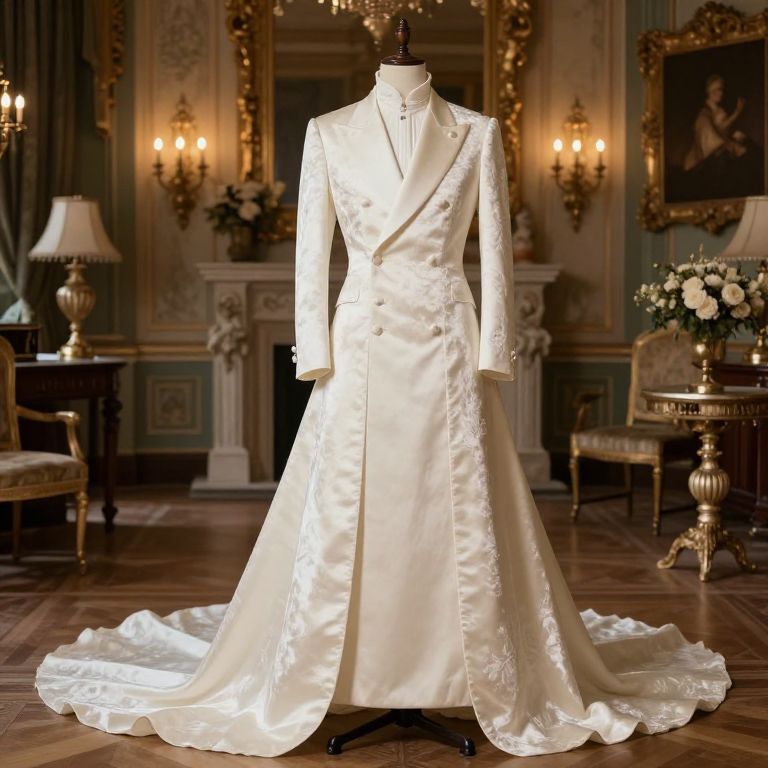 Photograph of an elegant, ivory satin wedding gown displayed on a mannequin in a luxurious, ornate room. The gown features a long, double-breasted front with button closures, a tailored jacket with a single breast pocket, and a floor-length, slightly flared skirt with a subtle train. The background includes gold-accented wall sconces, a fireplace with floral arrangements, and a large, framed portrait. The room's decor includes antique furniture with upholstered chairs and a table holding a white floral centerpiece. The wooden floor has a herringbone pattern, adding to the opulent setting.