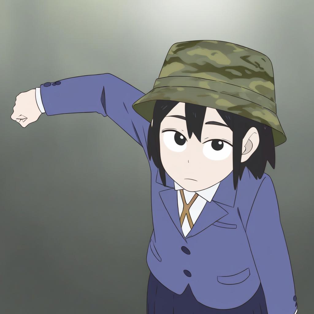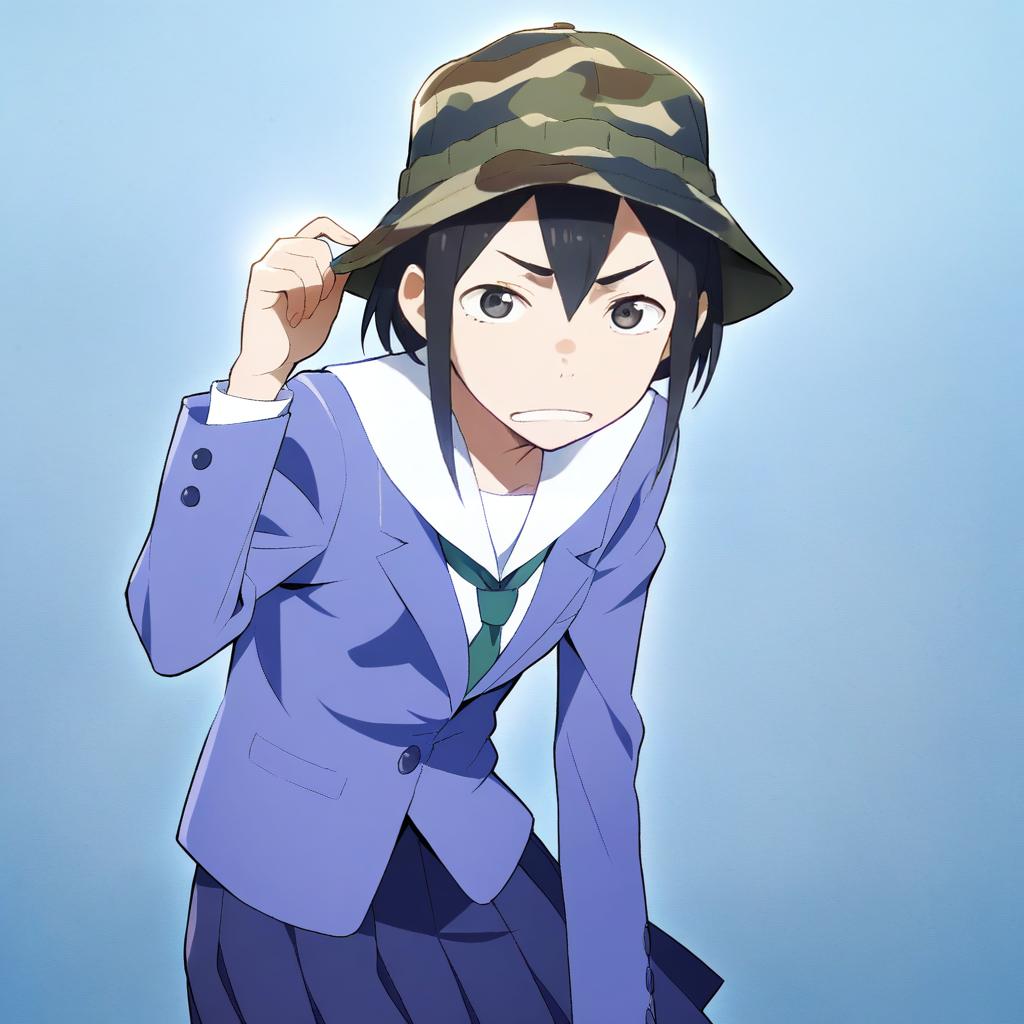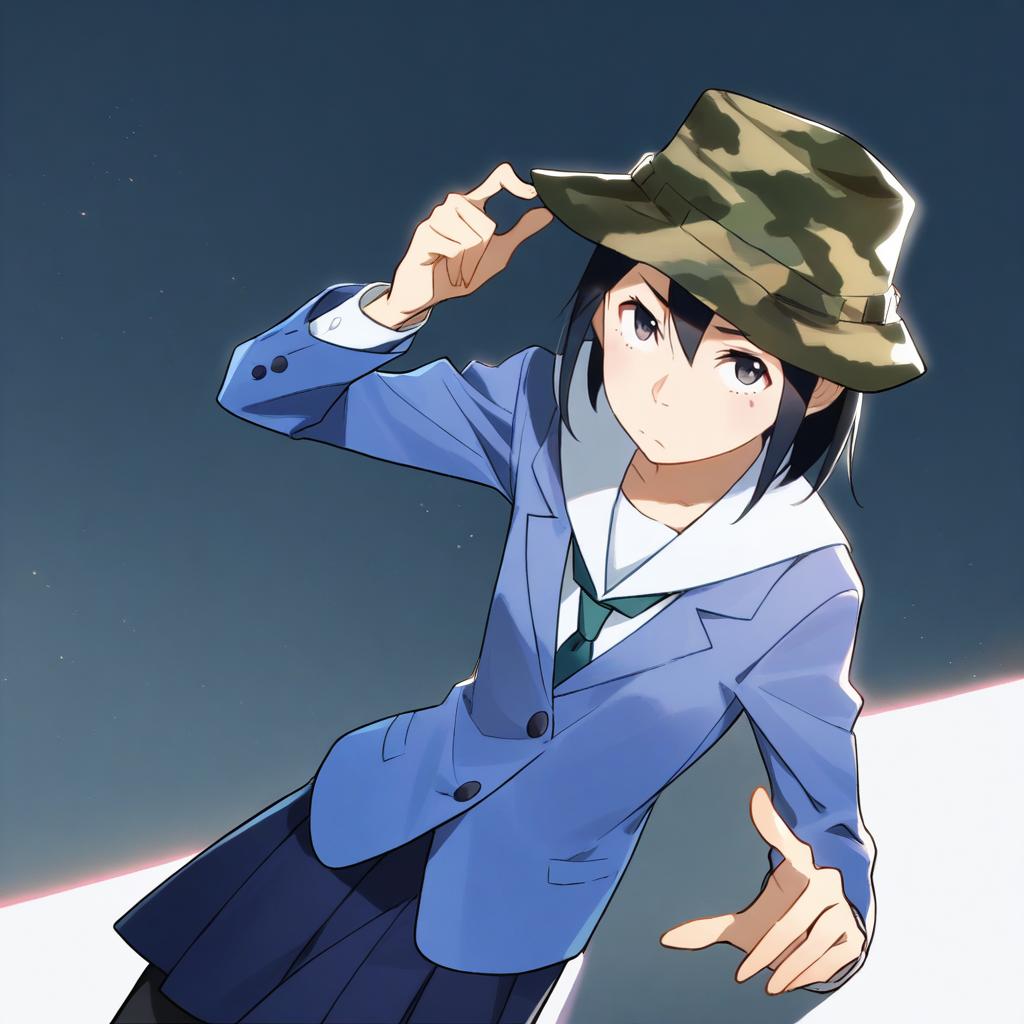 Asakusa midori, eizouken ni wa te wo dasu na!, 1girl, black eyes, hair between eyes, short hair, black hair, school uniform, school uniform, blue jacket, blue skirt, pleated skirt, bucket hat, camouflage headwear, long sleeves, by artist okuda yasuhiro, leet