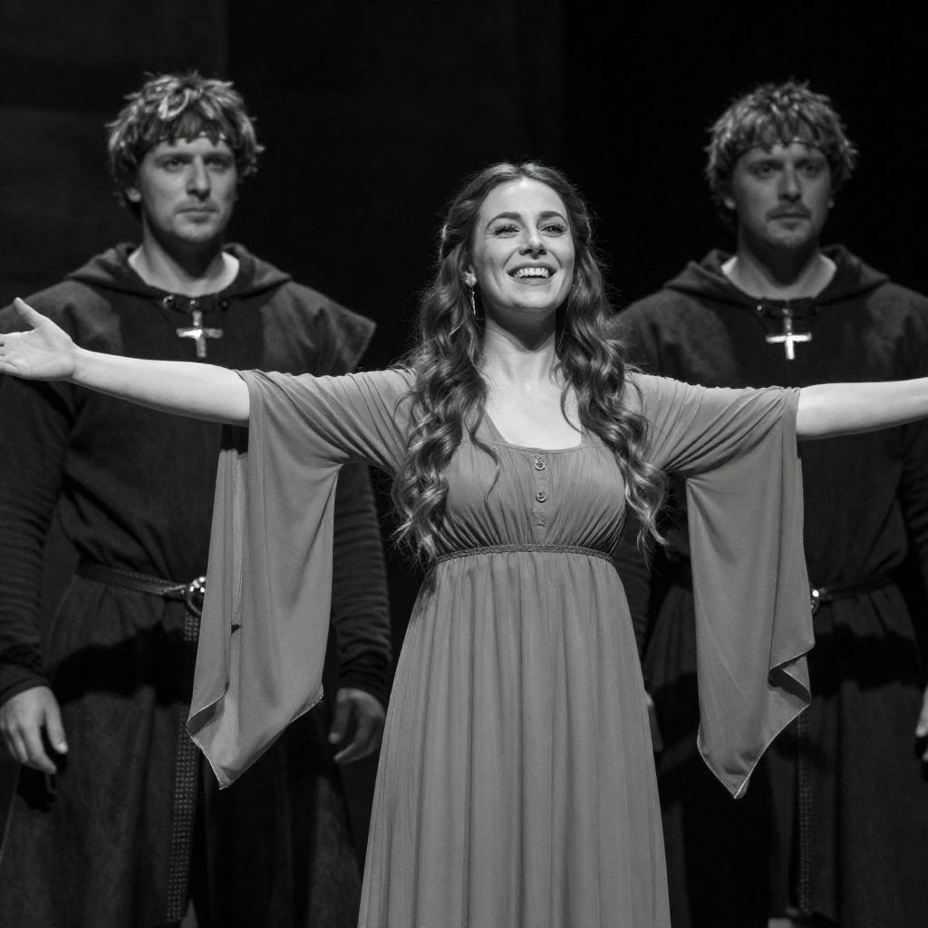 Black-and-white photograph of a woman in a dark dress and cape, hands clasped near her chin, standing to the left. A blurred figure with outstretched legs and hands is in the foreground on the right. Intense, defined facial expression on the woman. Background includes dark, ured wall and stone pillar. Two people.