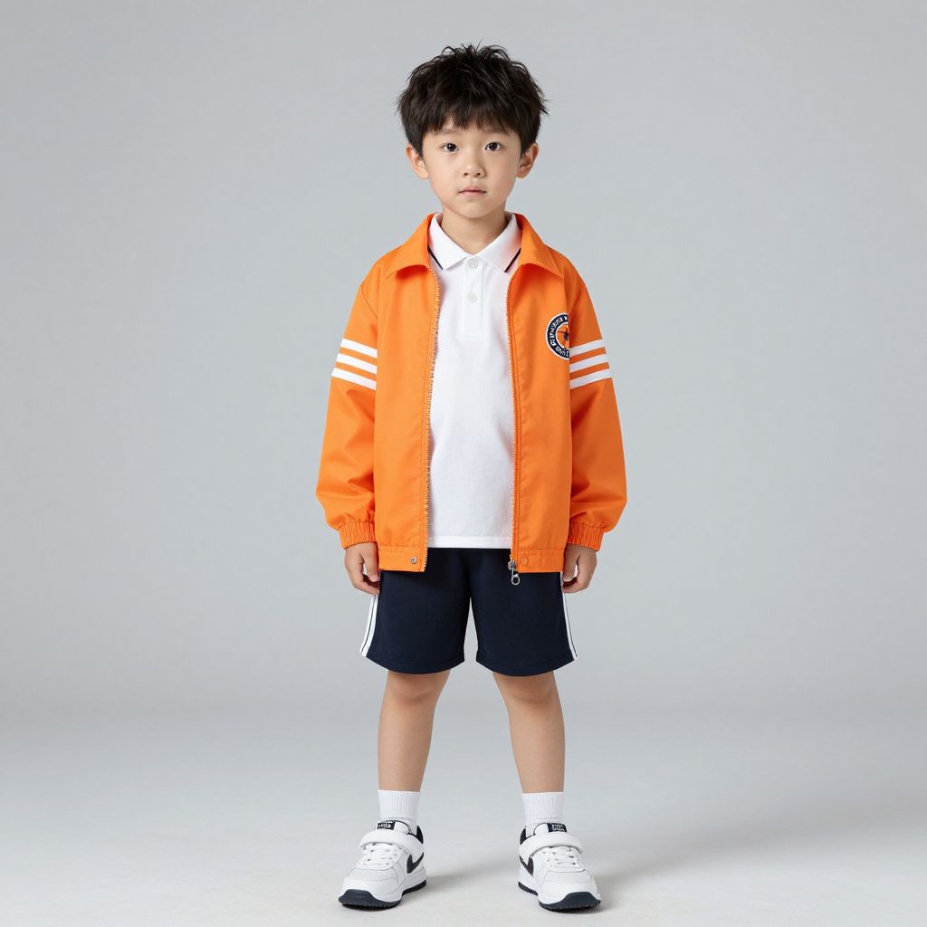 Photograph of a young Asian boy with short black hair, standing against a plain white background. He wears an orange jacket with white stripes on the sleeves, a white polo shirt, black shorts with white stripes, white socks, and white sneakers with black accents. His expression is neutral, and he stands with his arms relaxed at his sides. The lighting is even, highlighting the bright colors of his outfit. The image has a clean, studio-quality appearance.