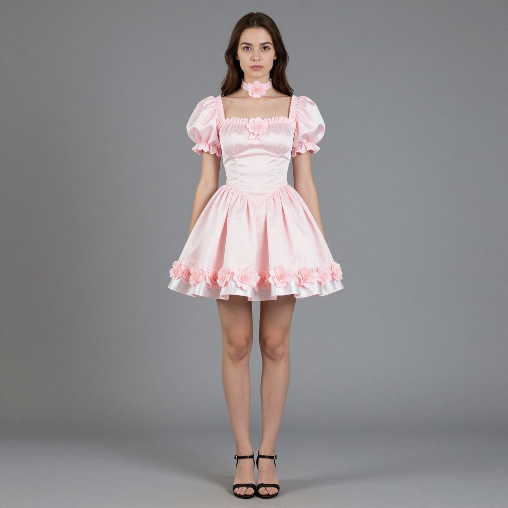 Fair lady costume, 1girl, solo, dress, brown hair, realistic, full body, standing, choker, puffy sleeves, flower