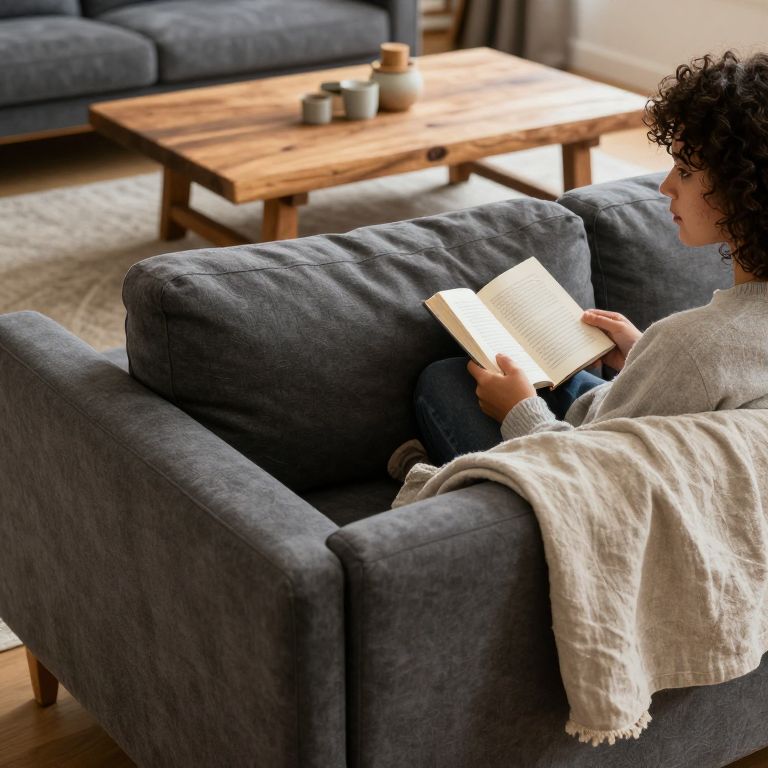 A cozy living room with warm natural lighting, featuring a large, rich gray upholstered sofa with a soft linen throw, a person with kind brown eyes and curly hair sitting on it, reading a book, and a rustic wooden coffee table in the background.