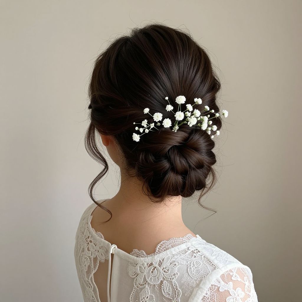 Elegant bridal hairstyle featuring a braided updo adorned with a delicate headpiece of baby's breath flowers, complemented by loose tendrils cascading down the sides, worn by a woman in a lace-trimmed white dress.
