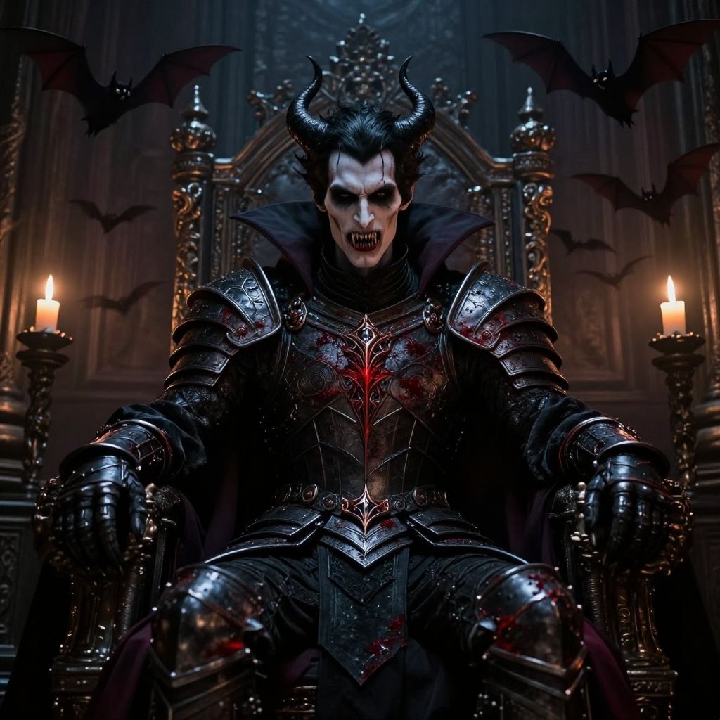 Vampire overlord in an ancient throne room, surrounded by bats and flickering candlelight, pale skin and sharp fangs visible, wearing intricate black armor with blood-red accents, ominous atmosphere
