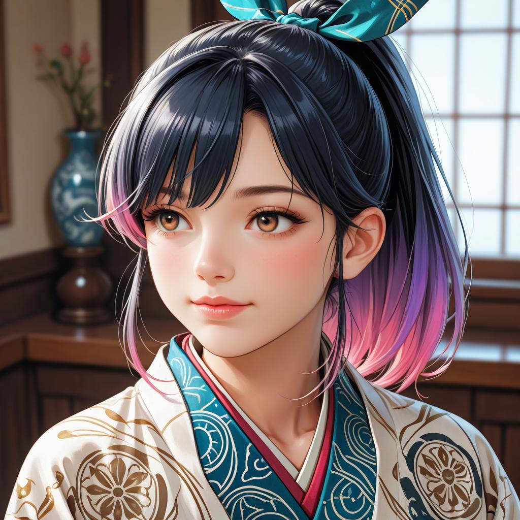 Admiral kancolle, 1boy, closed eyes, multicolored hair, yellow eyes, fang, blush, ponytail, hair ribbon, intricate patterns, vibrant colors, alluring atmosphere, crouching with intensity, naval map table, shoulder pads, nostalgic smile effortless