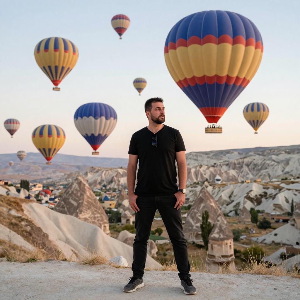 A man striking a casual pose in Cappadocia, Turkey, with colorful hot air balloons floating in the sky behind him. The setting showcases a scenic view filled with natural rock formations synonymous with the region.