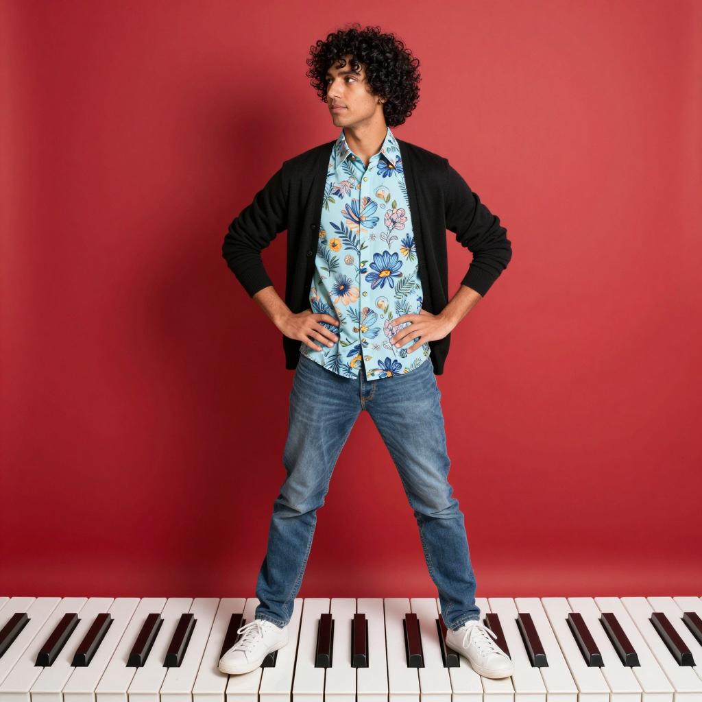 Man with curly black hair, light blue floral shirt, black cardigan, blue jeans, white sneakers, stands with legs wide apart. Red background, black and white piano keys floor. Hands on hips, looking to the side. Bright colors, sharp contrast.