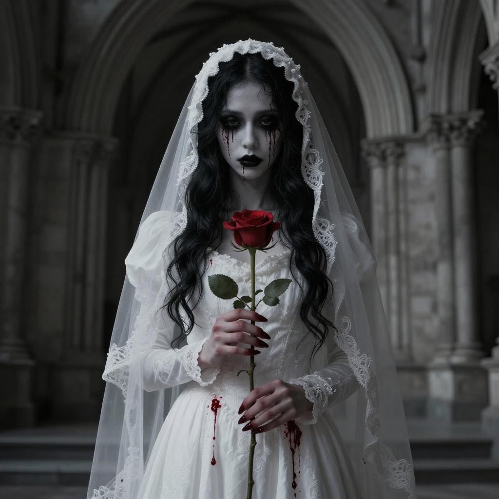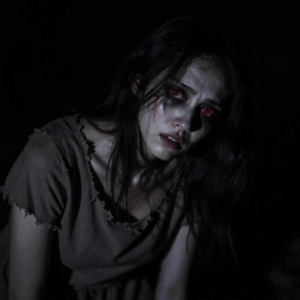 Girl with long brown hair, wearing a bloodstained pink dress, presses both red bloodied hands against a window. Intense expression. Background: light blue tiled wall. Black window frame. Two vertical window panes.