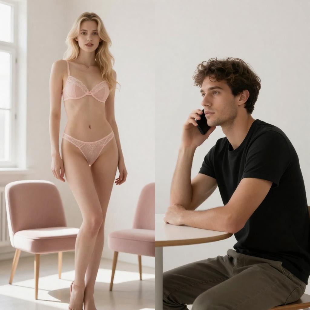 Photograph of two people in a split composition. Left: blonde woman in pink lingerie, standing in bright room with pink chairs, sunlight. Right: dark-haired man in black shirt, sitting at table, talking on phone, white walls.