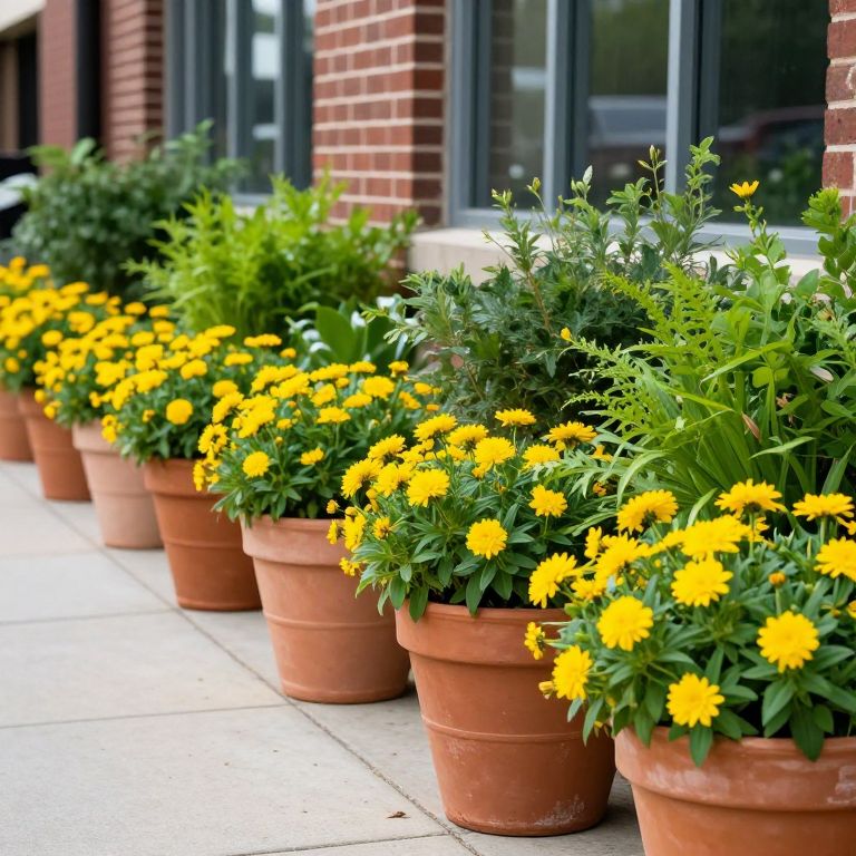 Vibrant garden scene showcases a row of terracotta planters filled with lush green foliage and bright yellow flowers, neatly arranged along a concrete sidewalk in front of a brick building with large windows.