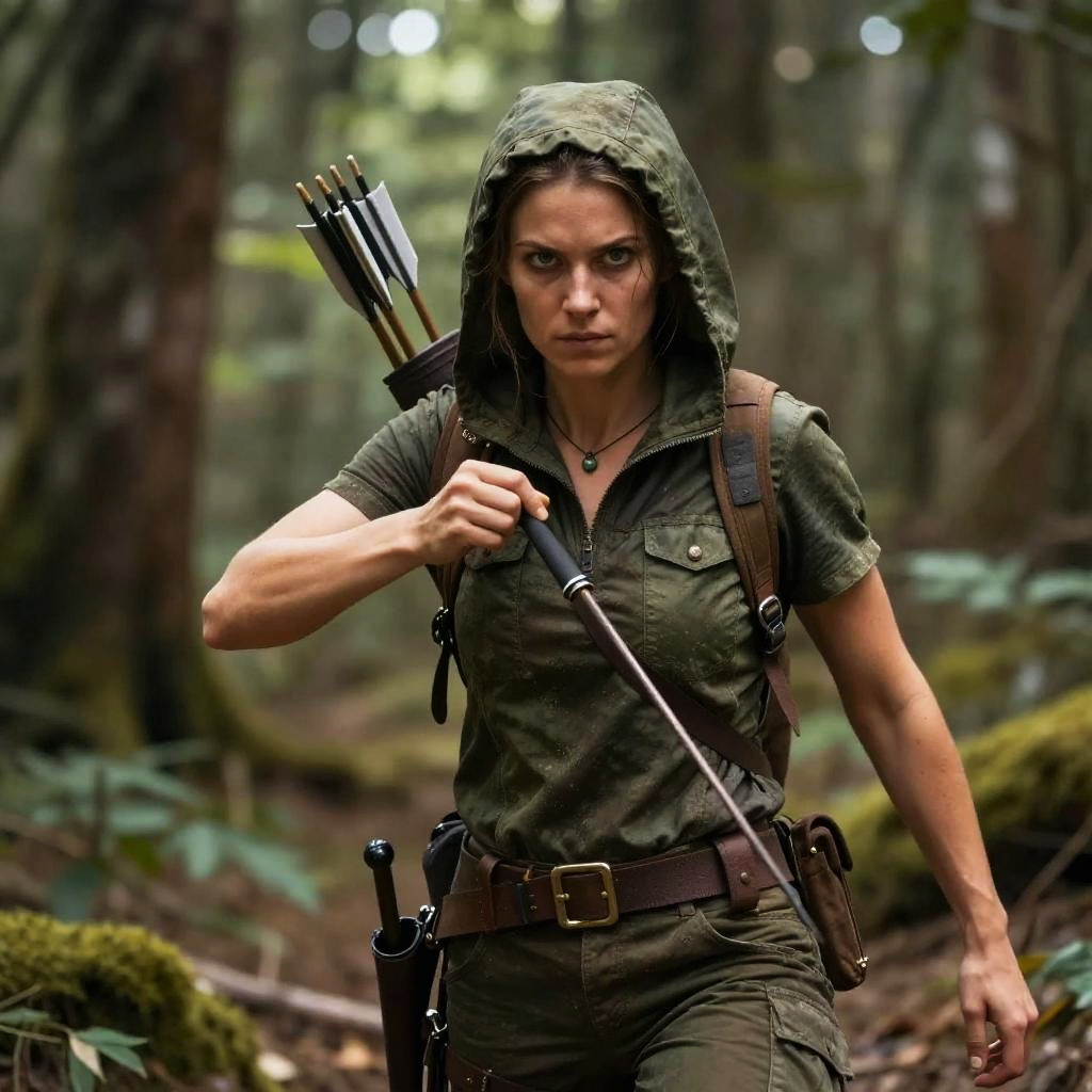 Photograph of a focused, muscular woman with long brown hair, wearing a green hooded tunic, archery quiver, and forest gear,