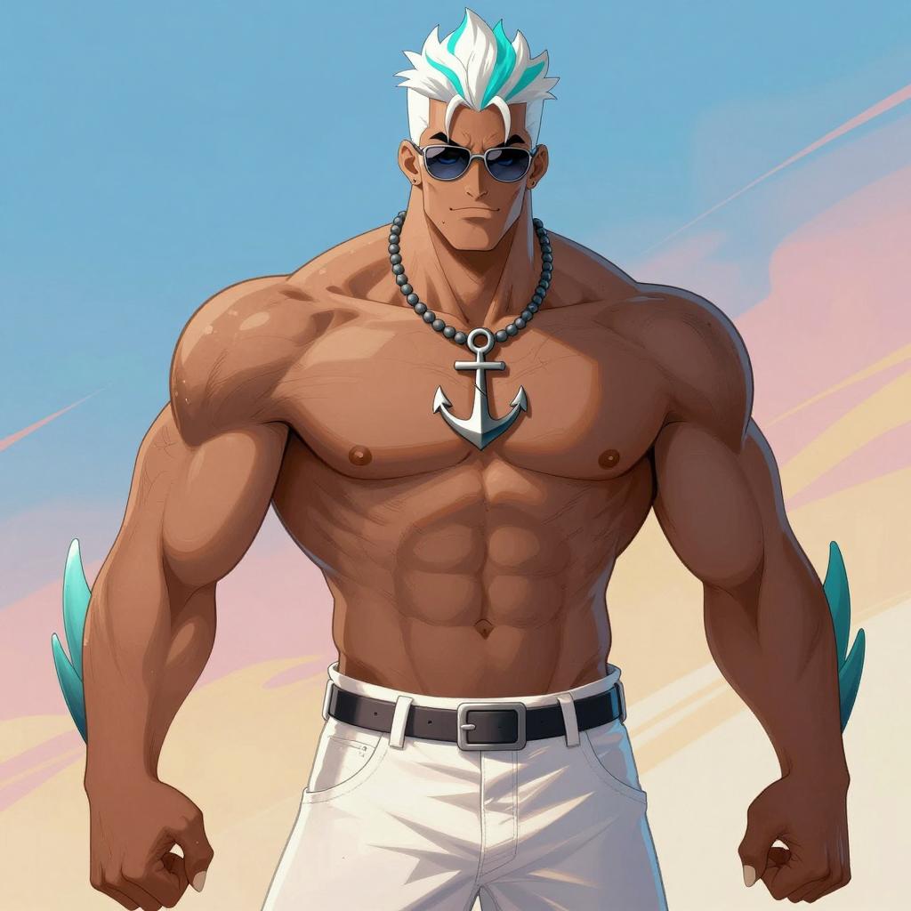 Detailed digital illustration of a muscular, dark-skinned mature male fish character with white and aqua streaked short hair and blue eyes. The character features sharp fingernails, fins on arms, an anchor necklace, and sunglasses. He wears white pants with a belt and has a well-defined muscular torso with large pectorals and abs against a dynamic colorful background.
