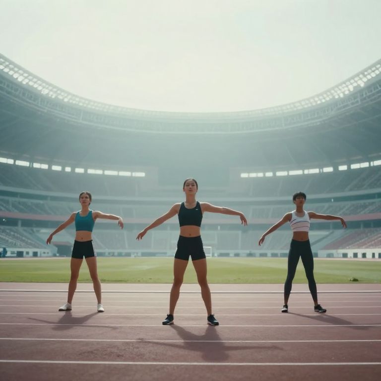 Photograph of three athletic women performing a dance routine on a track field in a large, sunlit stadium. They wear black sports bras and black shorts or leggings, with black sneakers. The woman in the center has her arms outstretched, while the women on the left and right mirror her posture. The background shows a vast, empty stadium with bright lights, green grass, and a red track. The women have toned, athletic builds and are focused on their movements. The image has a bright, almost overexposed sky, adding a sense of openness and energy.