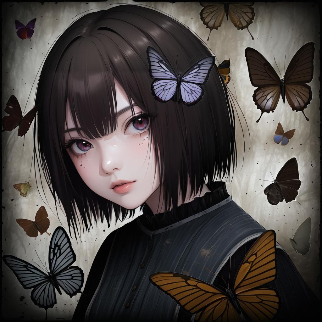 Digital artwork of an anime-style girl with short black hair and large brown eyes surrounded by multiple butterflies of various colors. The girl wears a black outfit with a subtle pinstripe pattern and has delicate facial features, including soft lips and small freckles. The background is muted and textured, enhancing the focus on the girl and butterflies.
