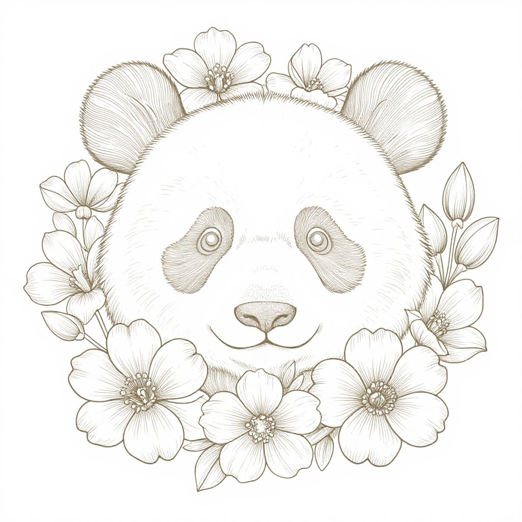 Black-and-white line drawing of a panda's face surrounded by blooming flowers, with detailed eyes and a gentle expression.