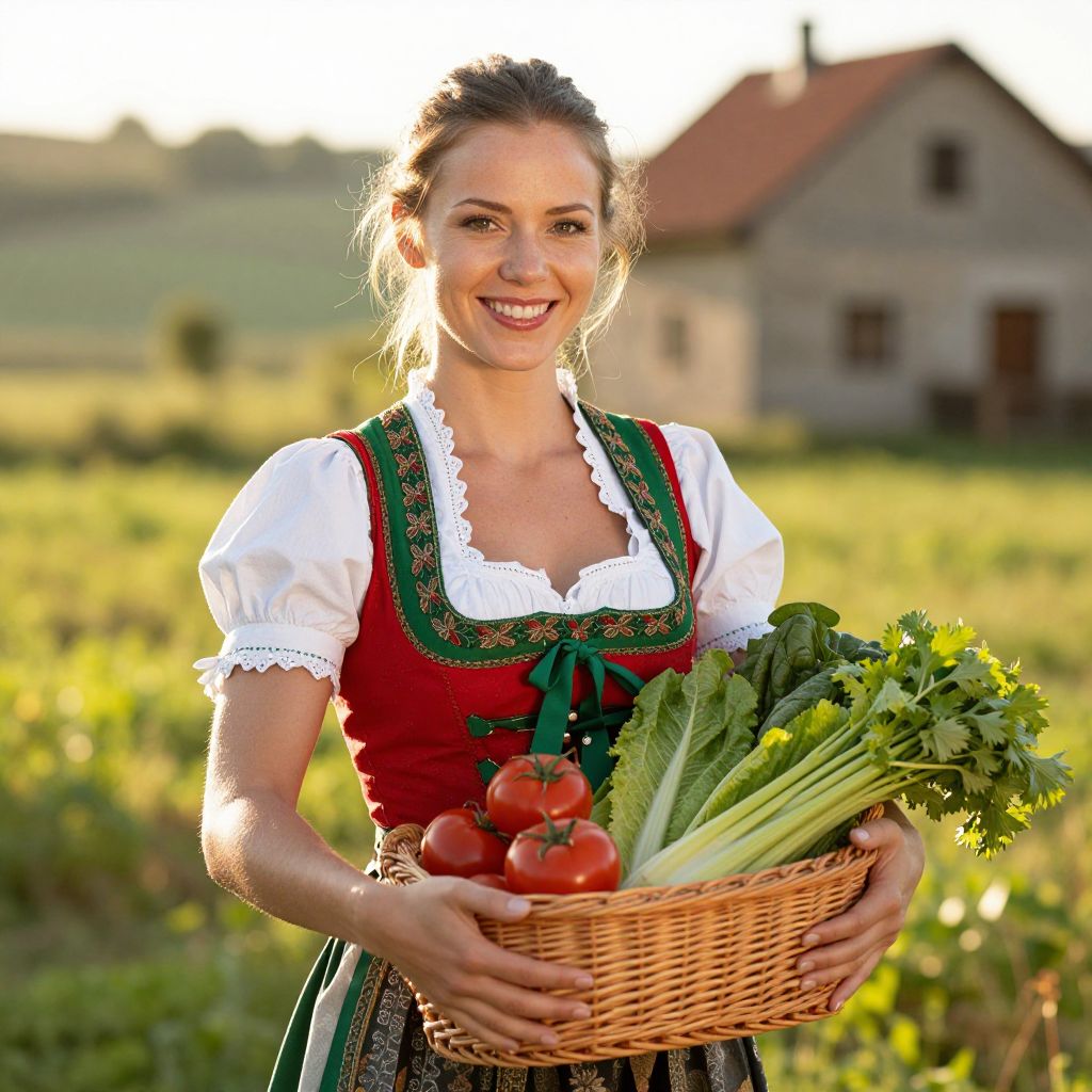 Photograph of a smiling young woman with light brown hair in a bun, wearing a traditional German dirndl with a red bodice, green embroidery, and white puffed sleeves. She holds a wicker basket filled with tomatoes, cucumbers, celery, and leafy greens. The background features a blurred rural scene with a green field and a stone house with a red roof. The sunlight casts a warm, golden glow, highlighting her cheerful expression and the vibrant colors of the vegetables and her outfit.