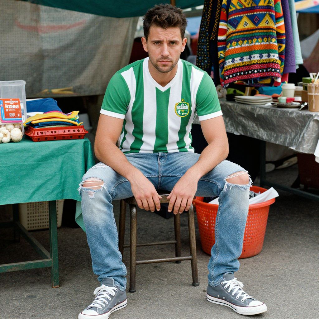 Photograph of a muscular, fair-skinned man with short, dark hair and a trimmed beard, sitting on a wooden stool at an outdoor market. He wears a green and white vertical striped soccer jersey with a green emblem, ripped blue jeans, and black sneakers with white laces. Behind him, there's a green table with a clear plastic cup, a red tray, and a bunch of white onions. A colorful, patterned garment hangs on the right, and a red plastic basket is on the ground to the right. The background includes a green canopy and other market stalls.