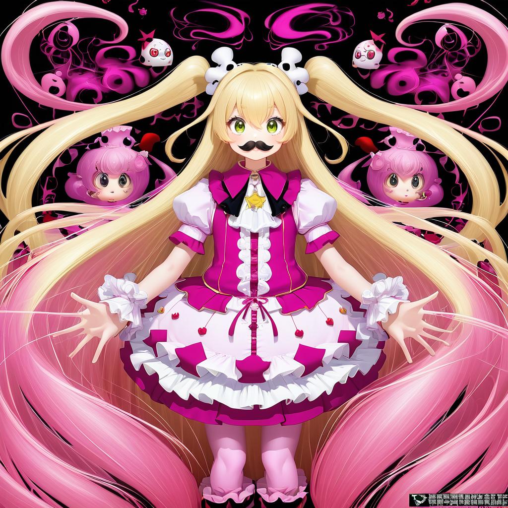 Anime-style illustration of a magical girl character with absurdly long blonde and pink hair styled in two side ponytails. She wears a vibrant pink and white frilly dress with puffy sleeves and a star decoration on the chest. The character has striking yellow eyes and sports a playful mustache. Surrounding her are whimsical pink and white animated elements. The background is black with stylized pink-purple swirling patterns.