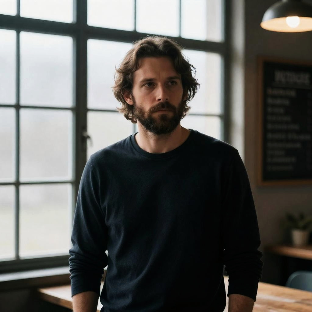 Man with brown hair and beard, wearing a brown cardigan and striped shirt, sits in a gray armchair. He rests his head on his hand, legs crossed, looking slightly to the side. Wood door and table in background. Soft light. Casual attire. Relaxed pose.