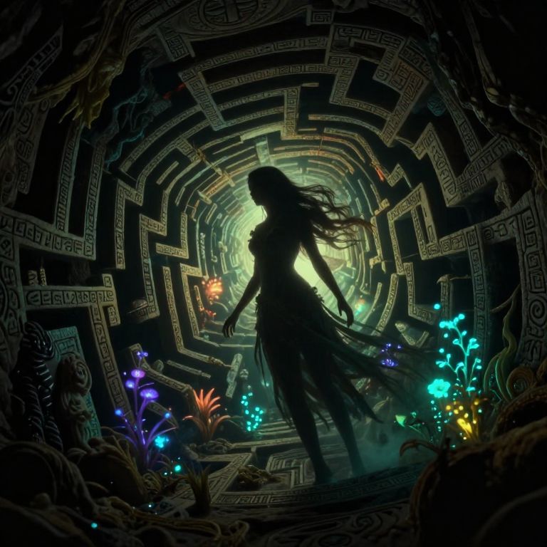 Craft an image depicting a mystical female figure emerging from a labyrinthine cave system, reminiscent of surreal dreamscapes. Captured from an unconventional perspective, her silhouette is illuminated by the otherworldly glow of luminescent flora and fauna, casting dramatic shadows across her form that dance with the light. The cave walls are intricately adorned with ancient symbols and cryptic patterns, invoking a sense of wonder and unease as they hint at untold stories and forgotten lore, drawing the viewer deeper into this captivating vision.