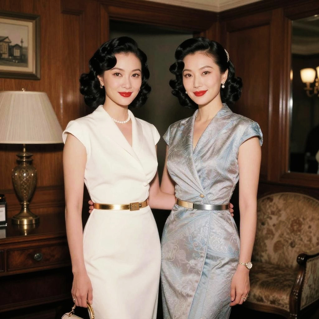 Dommy mommys in vintage 1940s style, elegant dresses and bold makeup, standing in an old-fashioned parlor with rich wood accents, soft film grain, warm and inviting ambiance