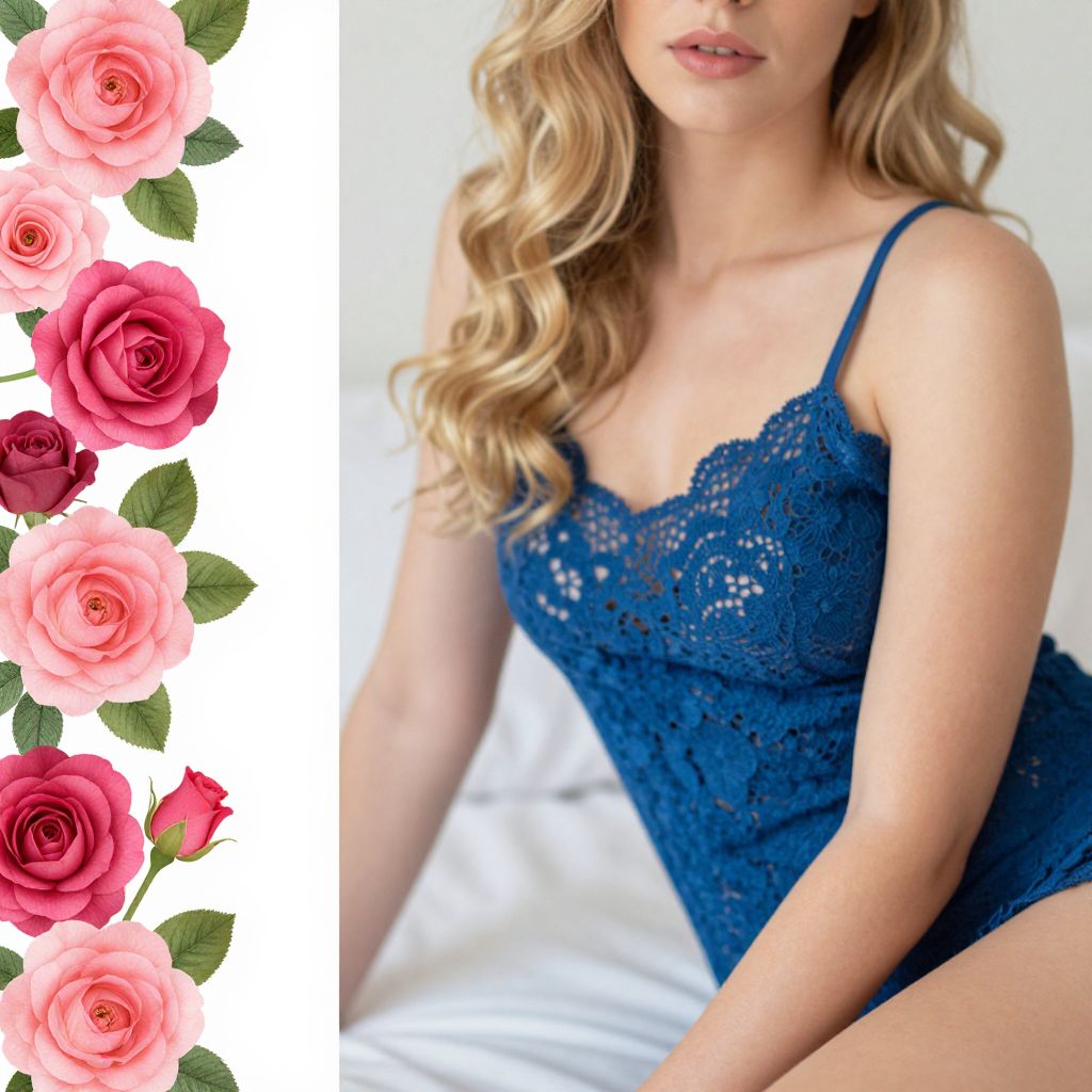 Photograph of a blonde woman with wavy hair, wearing a blue lace camisole, sitting on a bed with white sheets. Her face is partially out of focus, showing soft pink lips. A vertical strip on the left side of the image features vibrant pink and red roses with green leaves, creating a contrasting floral pattern against the white background.