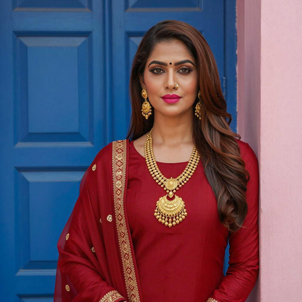 Portrait of a woman with long brown hair and pink lipstick wearing a red traditional Indian outfit. She is adorned with an ornate large gold necklace and matching gold earrings. The background features a blue wooden door with geometric patterns and a pink column against which she is standing with a neutral facial expression and straight posture.