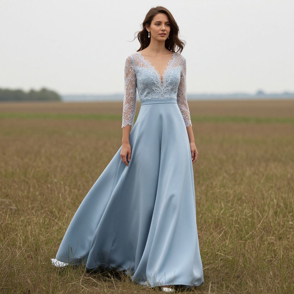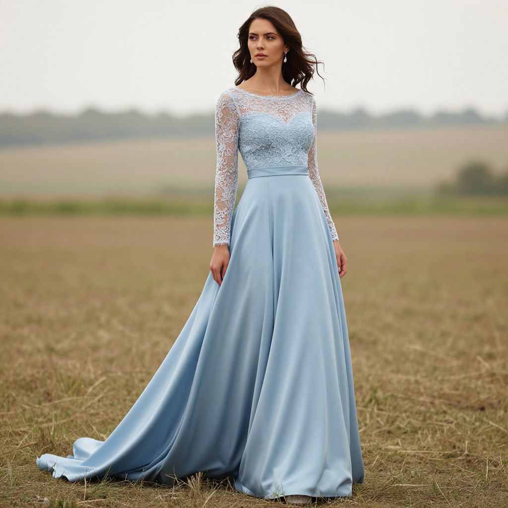 Photograph of a woman standing in a grassy field with a blurred, expansive landscape in the background. She has fair skin, dark brown wavy hair, and a serious expression. She is wearing a long-sleeved, light blue satin gown with a fitted lace bodice and a flowing skirt that extends into a gentle train. The lace bodice is sheer, featuring intricate floral patterns. Her posture is straight, and she looks directly at the camera. The sky is overcast, providing soft, diffused light that highlights the gown's smooth texture.