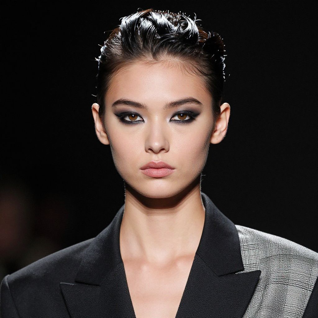 A close-up portrait of a fashion style model with striking makeup and a statement hairstyle, wearing a high-fashion outfit that highlights the latest designer pieces, photographed in a high-contrast lighting setup for dramatic effect.