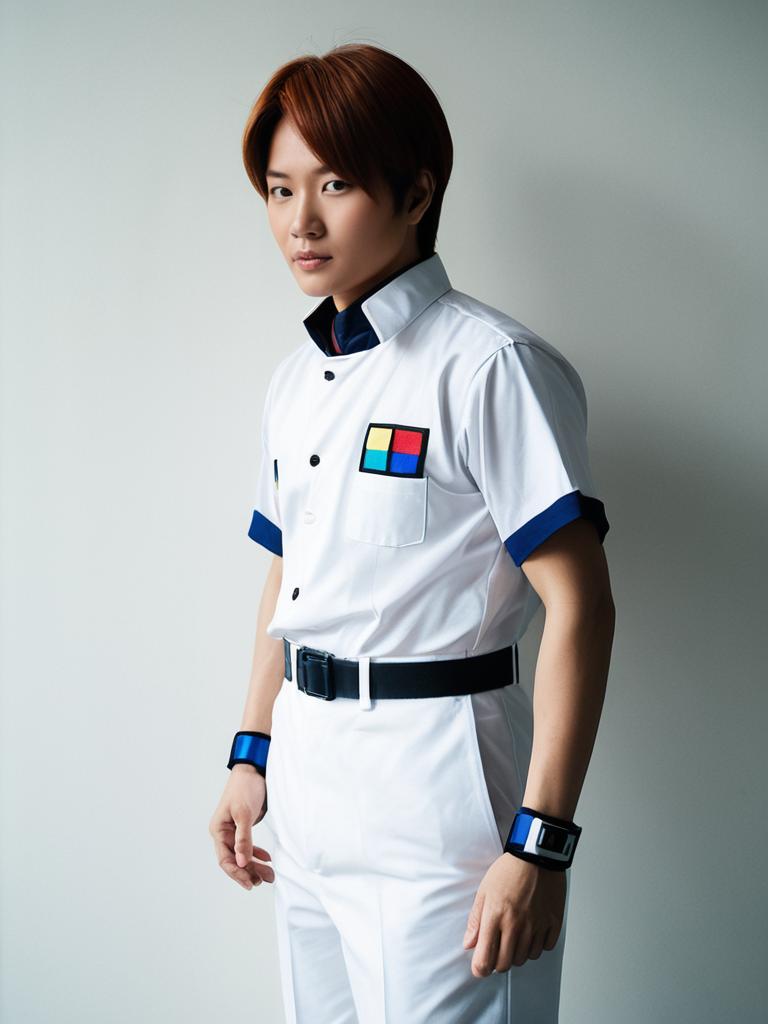 Man cosplay. Wearing Shinji (Kunio-kun) costume. Realistic photo. Dressed as Shinji (Kunio-kun) --sref 1400
