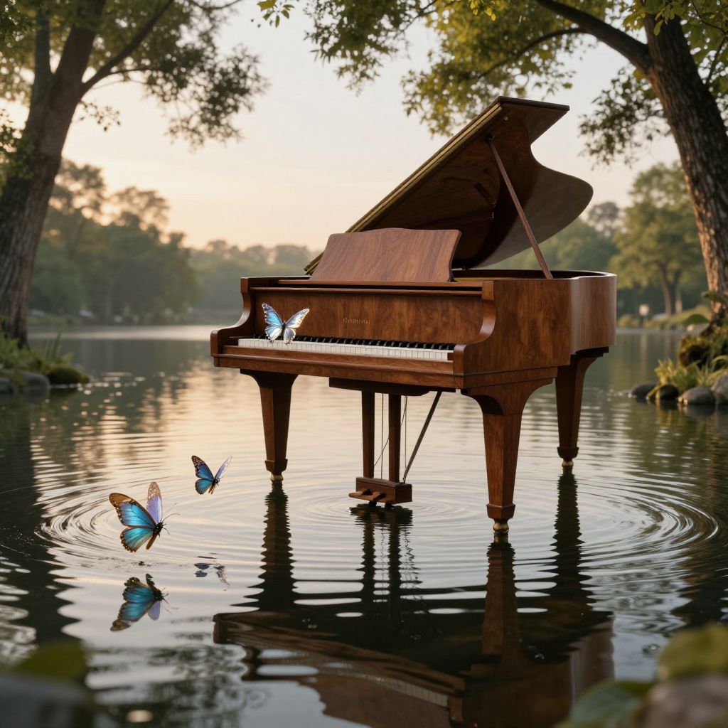Photograph of a polished, wooden grand piano partially submerged in a serene, reflective lake at sunset. The piano's lid is open, and three blue butterflies with orange accents hover and land on the white keys. Ripples spread from the piano's base, creating a mirror-like effect on the water's surface. Surrounding the lake are tall, leafy trees with soft, golden light filtering through. The background features a blurred treeline and a gentle, warm sunset sky. The image combines natural beauty with surreal elements, creating a tranquil, dreamlike scene.
