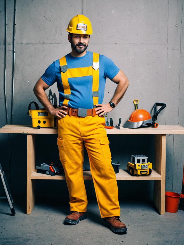 Man in Bob Builder Costume, full-body cosplay photo with helmet and tools