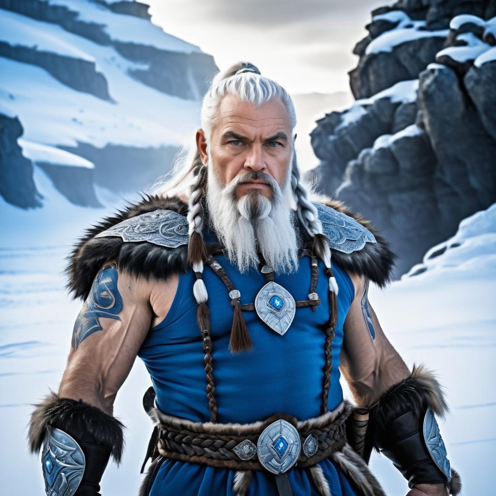 Portrait of a muscular elderly Viking man with pale skin, braided gray beard, and piercing blue eyes. Set in a snowy landscape wearing fur armor, inspired by Frank Frazetta, Boris Vallejo, H.R. Giger.