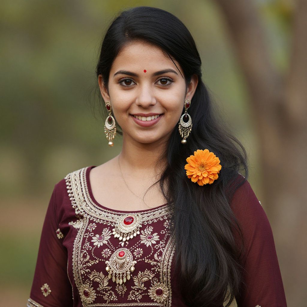 Nice traditional outfit, 1girl, solo, long hair, jewelry, earrings, smile, dress, flower, blurry, black hair, outdoors, brown eyes, brown hair